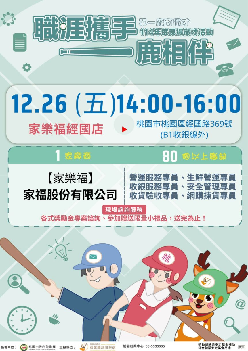 轉知114年12月26日(星期五)家樂福經國店單一廠商寒假工讀生徵才活動 預計於114年12月26日(星期五),在家樂福經國店(地址:桃園市桃園區經國路 369 號)辦理 單一廠商寒假工讀生徵才活動。 敬請老師協助於學園(系所、班級、公告系統或群組)轉知學生,讓有求職或工讀需求的同學能即時掌握就業資訊。